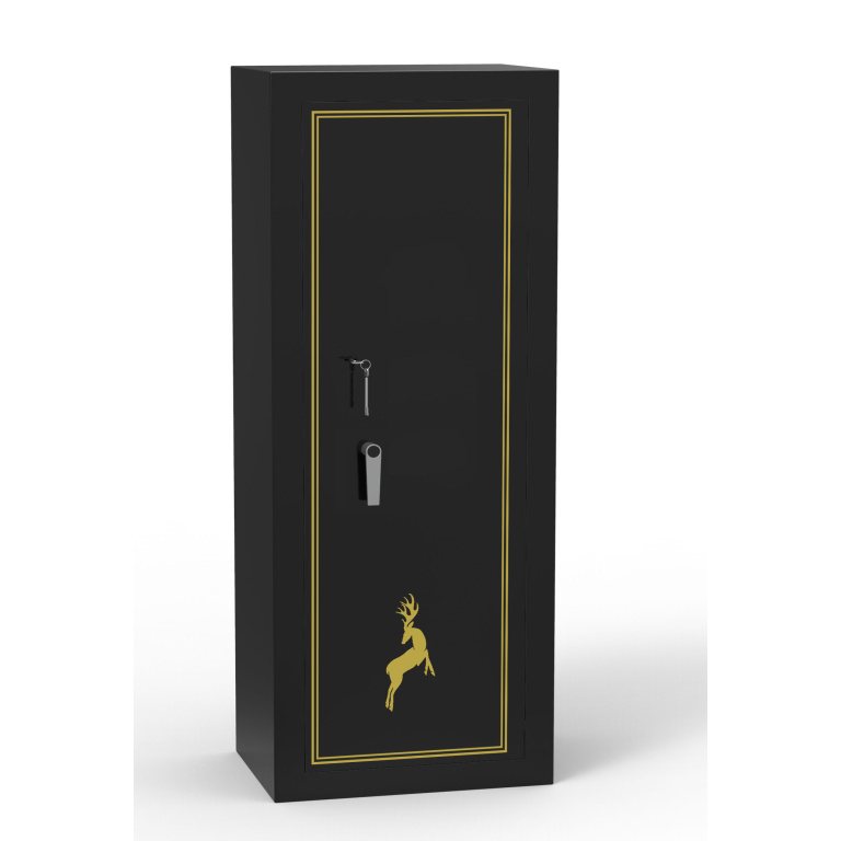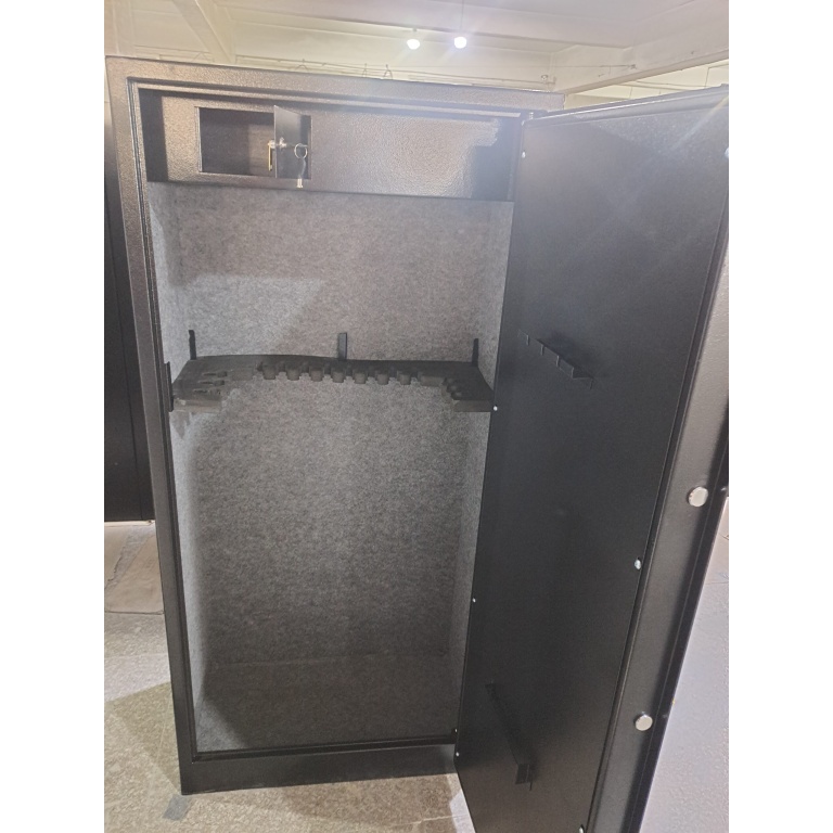 Fallegur og vandaður viðurkenndur byssuskápur úr mjög hörðu stáli með öruggum læsingum 5 boltar sem læsast í hliðar og svo einn upp og einn niður.