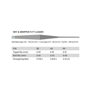 This leader has a unique taper that tapers up towards the front and then down again towards the tippet. This gives more mass in the front section and a more powerful turnover when you cast heavier nymphs and rigs of dry and dropper. The leader is ready to use as it is with a tippet length of 100 CM, when fishing in smaller rivers and creeks this is sufficient tippet length and longer can be a hassle to control due to lack of space and the short drifts/presentations needed.