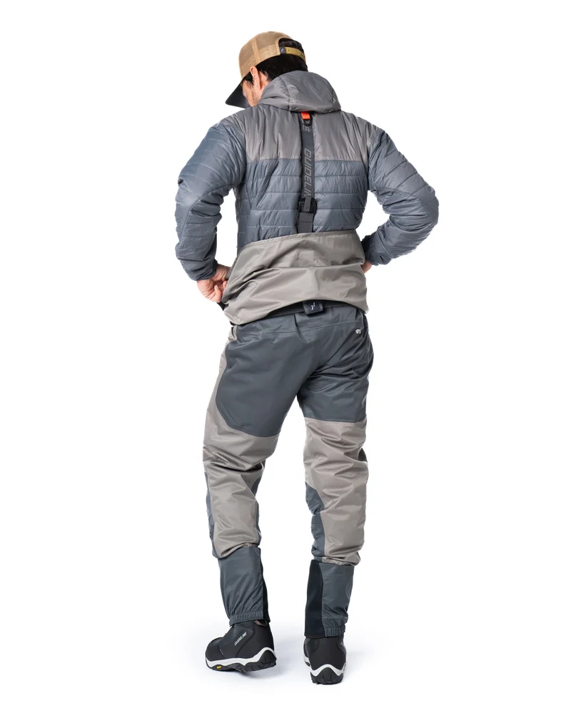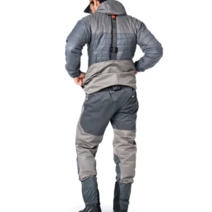 Að framan eru tveir vatnsfráhrindandi YKK AquaGuard® rennilásvasar með góðu geymsluplássi, og þar fyrir neðan eru opnir vasar til að verma hendur– fullkomnir á köldum veiðidögum. Á vöðlunum eru tvær Hypalon-festingar fyrir aukahluti, auk innri lóðrétts rennilásvasa með AquaGuard® rennilás og festingarflipa fyrir þurrkun á flugum. Á bakinu er D-lykkja fyrir háf.